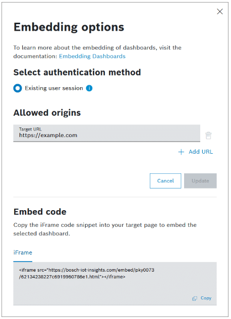 When using Bosch IoT Insights inside an iFrame, the dashboard hyperlinks are used to forward to its target regardless of the embedded state.