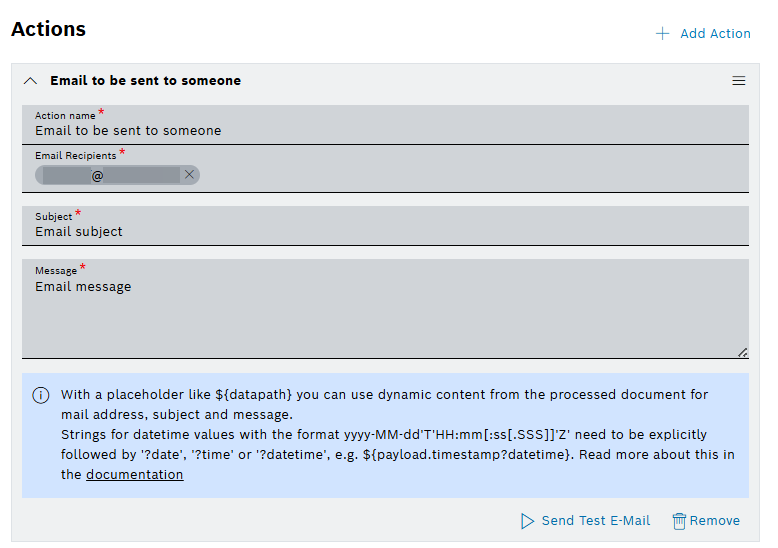 Typing ${ in a field that supports placeholders – marked with ${} at the end of the filed – displays the list of options to choose from: