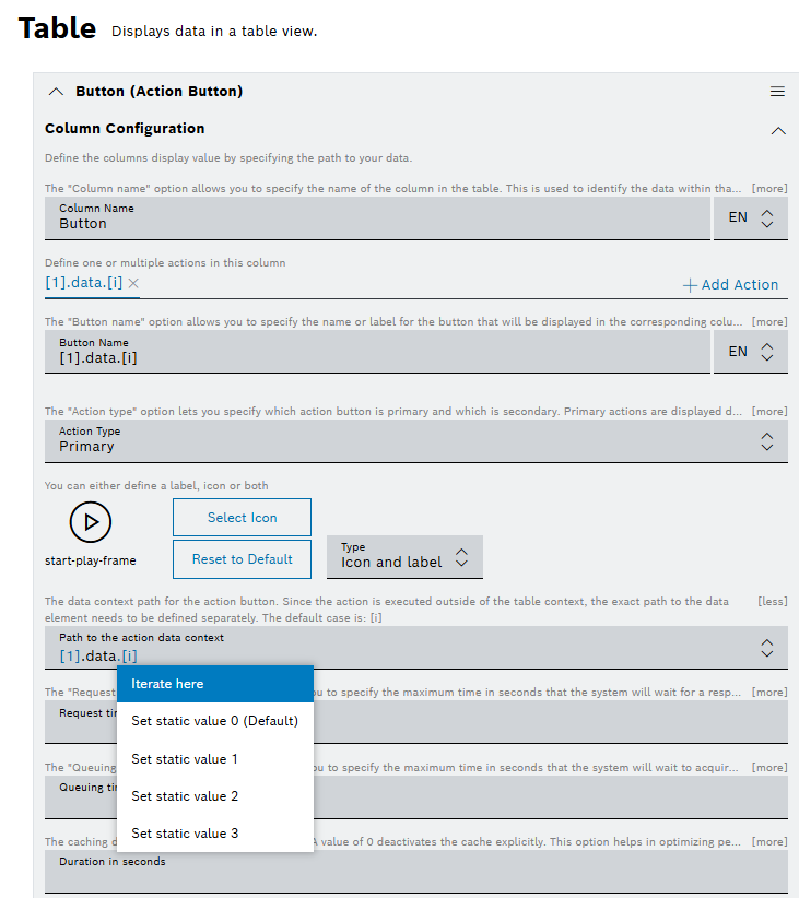 The Action Button column supports the path to the context of the action data, so that you can define the nested item of the data for iteration: