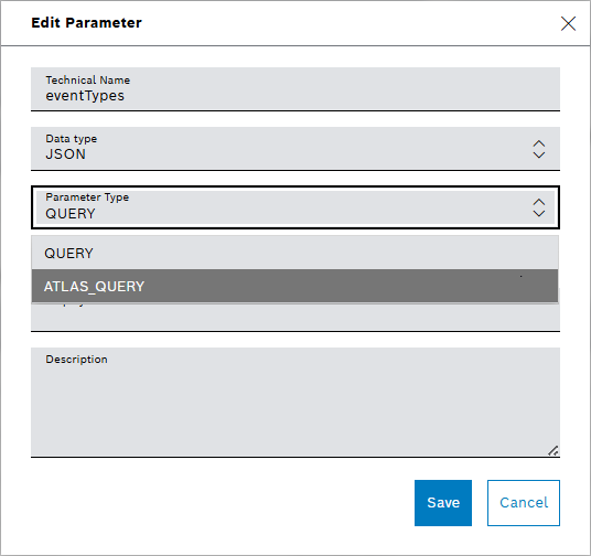 A new parameter type ATLAS_QUERY is available for Data of type JSON. From Data Explorer > Add Query Template > Add Parameter, select the JSON type for the Data. Then you will be able to choose from the drop-down menu options of QUERY or ATLAS_QUERY Parameter Type: