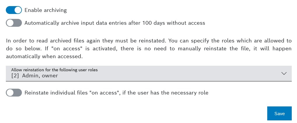 3. From the drop-down menu called Allow reinstation for the following user roles, select the roles within the project which will be allowed to reinstate already archived files. Be aware, that this includes also rights to cost-generating early reinstating as well.