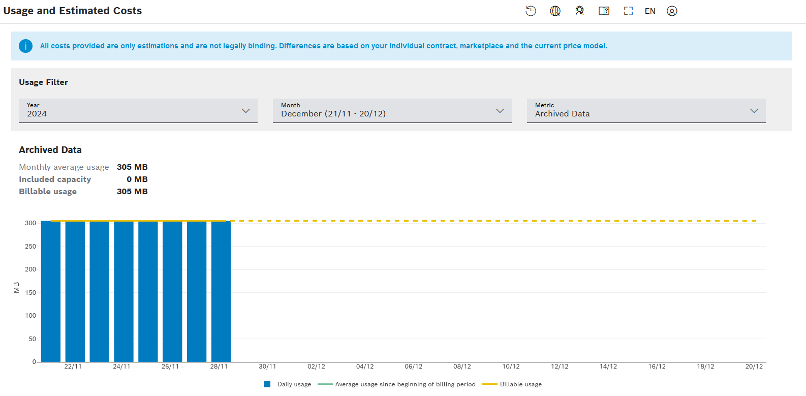 To check the costs related to the already archived data, navigate to Admin > Usage and Estimated Costs and on the Metric field's drop-down list choose Archived Data. For further details, refer to Usage and Estimated Costs.