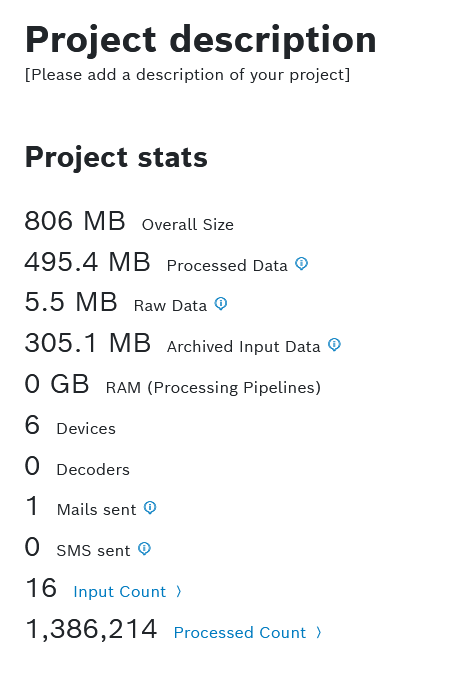 To check the volume of archived data, go to Overview on the left navigation and check the Archived Input Data reported by the Project stats widget, which is pre-configured on the main dashboard.