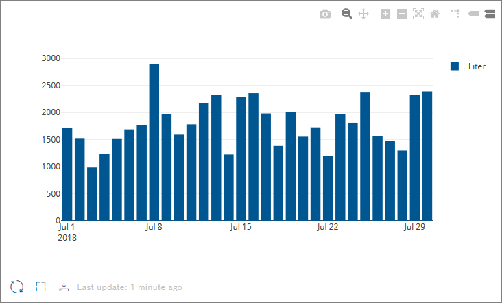 Using the Bar Chart widget, data can be displayed as a bar. The bars are based on coordinates for the x-axis and y-axis. A bar chart mostly represents a combination of time (x-axis) and another signal (e.g. pressure for y-axis).
