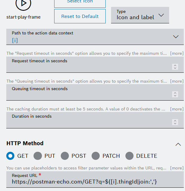 - In the Request URL field, enter the request URL to the third-party system. In the URL, you can refer to entries from the data source, with a path to the data element in the nested structure.