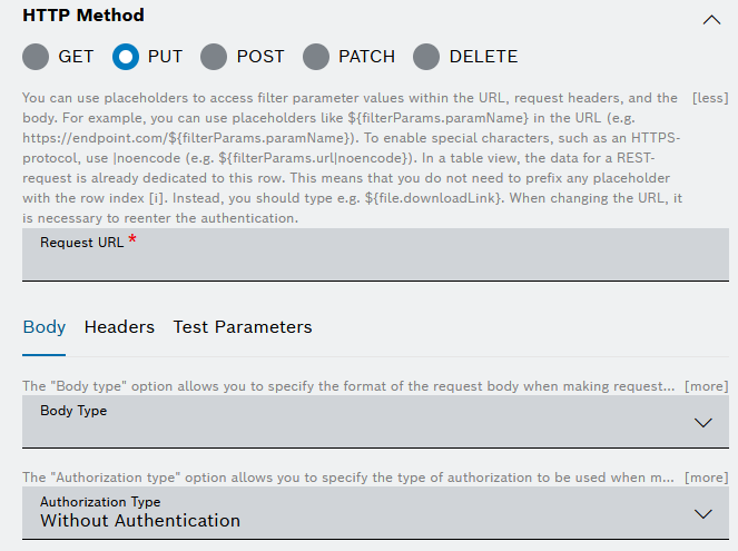 The Body type option allows you to specify the format of the request body when making requests to the REST API. It is not available for the GET and DELETE HTTP methods.For Raw Data, enter the request body.