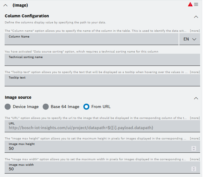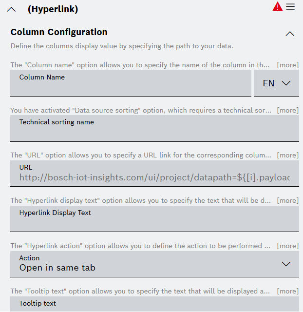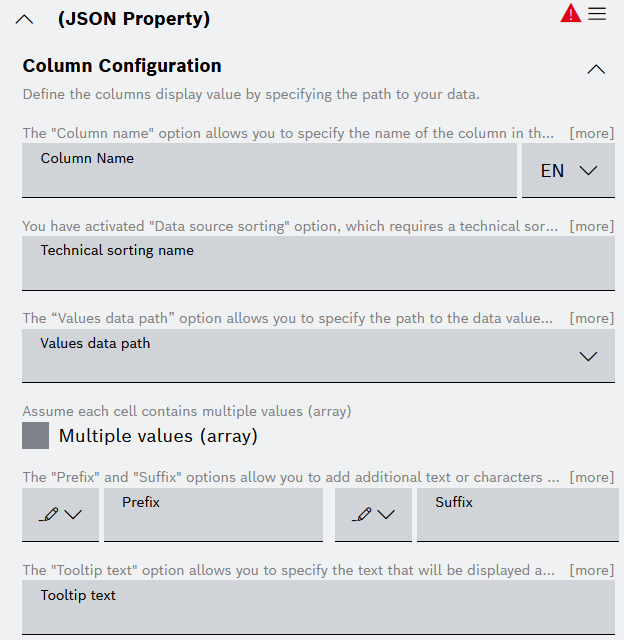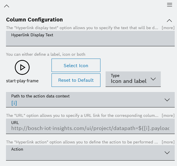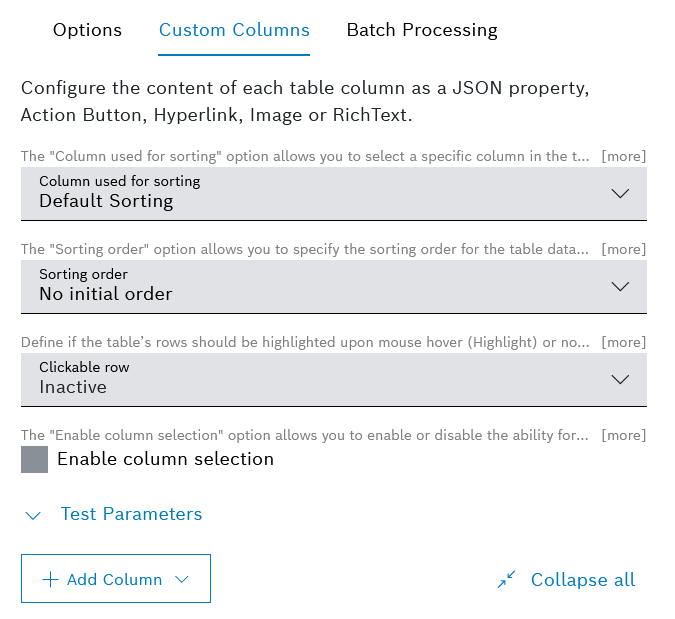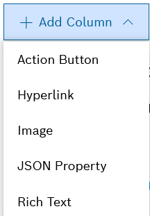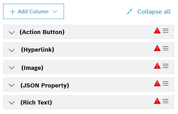 You can choose between: Action Button, Hyperlink, Image, JSON Property, and Rich Text. - When you have added multiple columns, use the Collapse all and respectively Expand all options to navigate more easily to the respective column configuration editor.