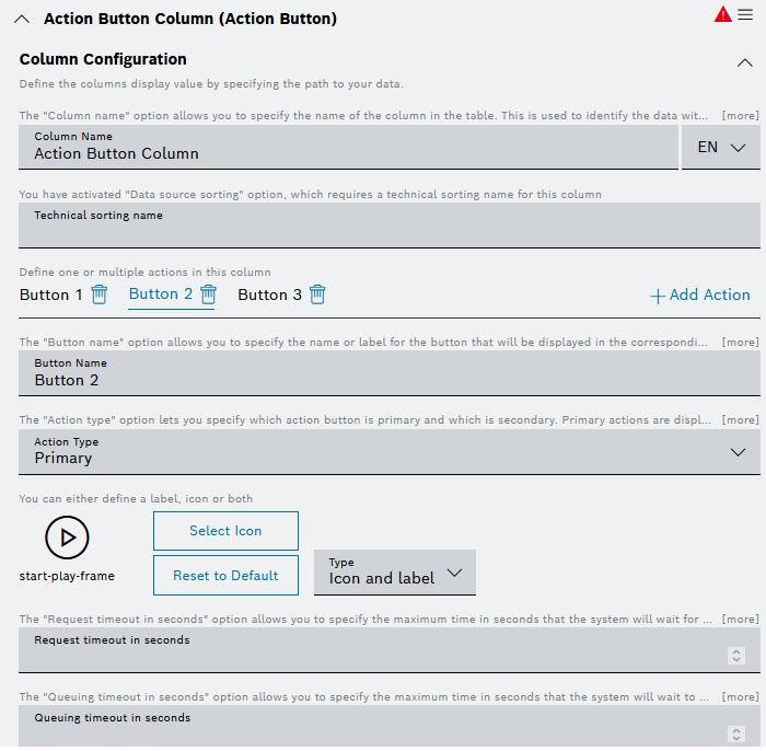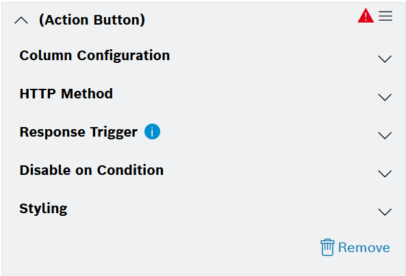 For the Action Button column type, the configuration options are grouped into the following sections: