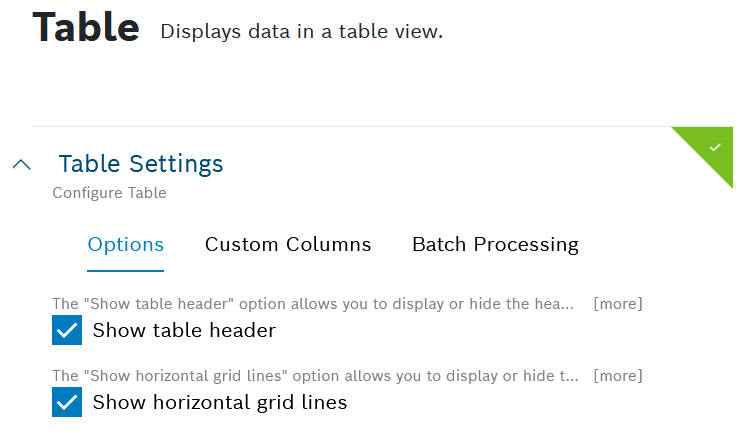 Open the Table Settings pane of the widget's configuration editor and use the dedicated tabs, namely Options, Custom Columns, and Batch Processing, to configure the table view.