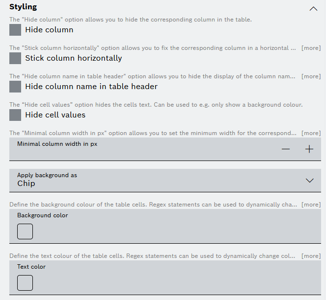 - Styling.The styling section provides the same configuration options for all column types besides JSON, which has an additional option for color range definition.