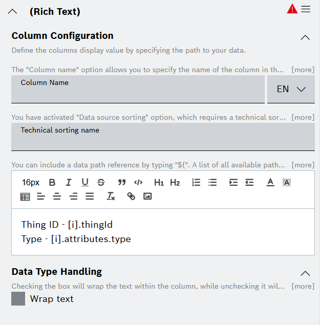 For a Rich Text column type, the configuration options are grouped into the following sections:
