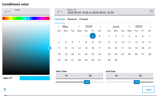 You can choose between a Default color and a Conditional color by means of the square icon and the plus icon in the field, respectively.