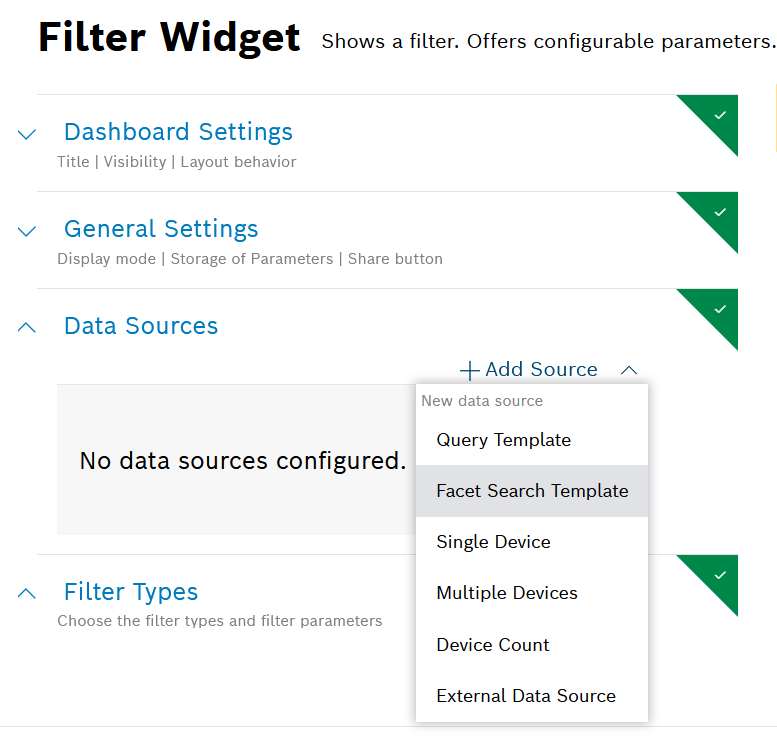 - Expand the Data Sources section, click Add Source and select the Facet Search Template option.