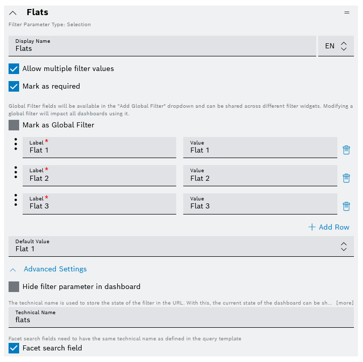 - Add a Selection filter type with filter name Flats, technical name: flats, and an additional option: Allow multiple filter values.