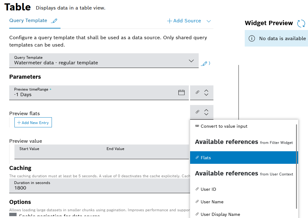 - In the widget configuration editor that opens, configure the Data Sources section as follows: