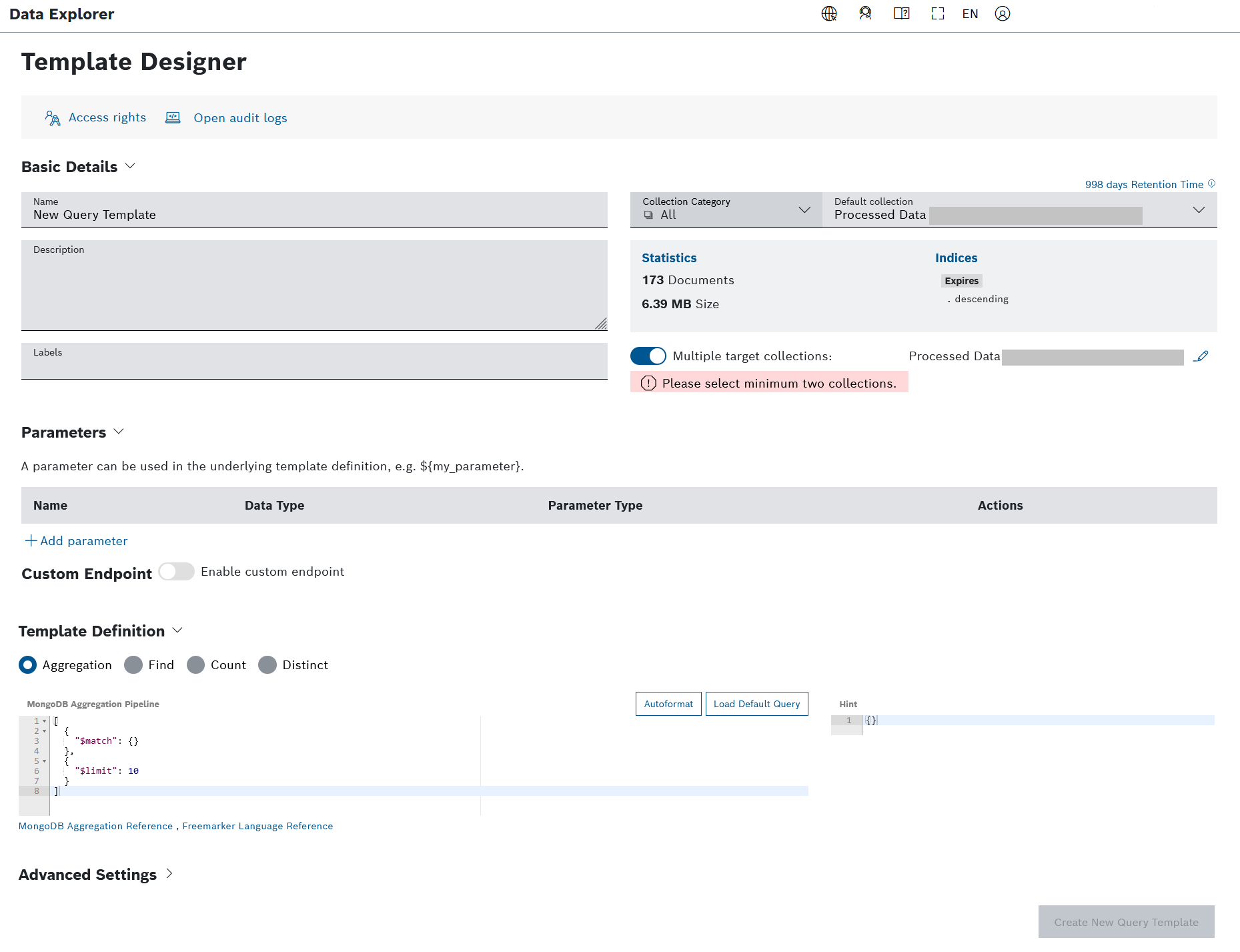 - In the Multiple Target Collections toggle, choose whether this query template can be run against only one collection (toggle deactivated) or against multiple collections (toggle activated).If the toggle is activated, you must select minimum two collections, i.e. the default one plus at least one more. Until then, the Create New Query Template button on the bottom of the Template Designer will be disabled.