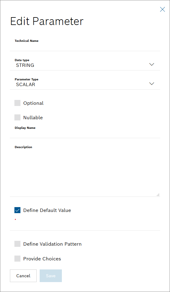 → The Edit Parameter dialog is displayed. - In the Technical Name field, enter the technical name of the parameter.