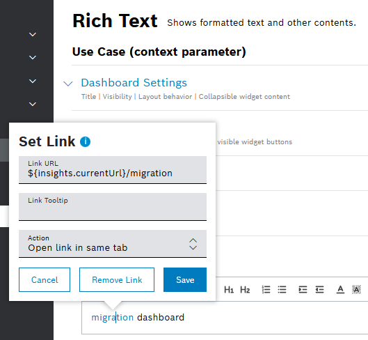 - Optionally, activate the checkbox for Enable breadcrumb navigation, which will display the different levels in case of nested dashboards.