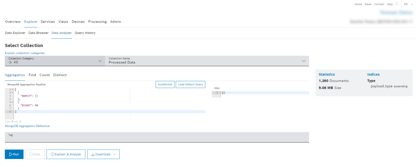 The Data Analyzer represents the expert mode for sending queries against the project-specific MongoDB collections of the backend (i.e. MongoDB Query Service). Processed data as well as Thing History data can be analyzed.