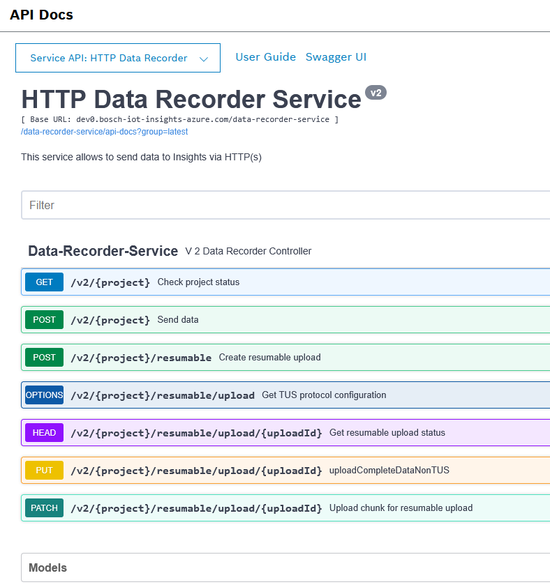 You can find detailed endpoint descriptions in the API documentation itself, e.g. at https://bosch-iot-insights.com/ui/pages/api/data-recorder/latest.