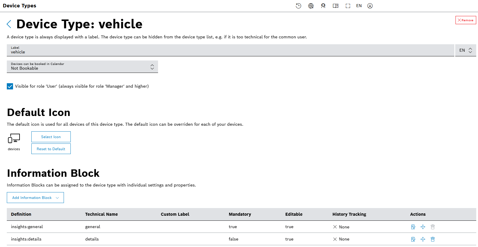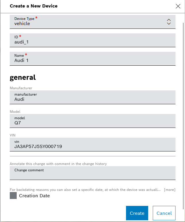 You can create separate device types for your vehicles and for the associated equipment for example. You can also configure optional or required properties, with or without default values, which will be inherited by all devices of this type.