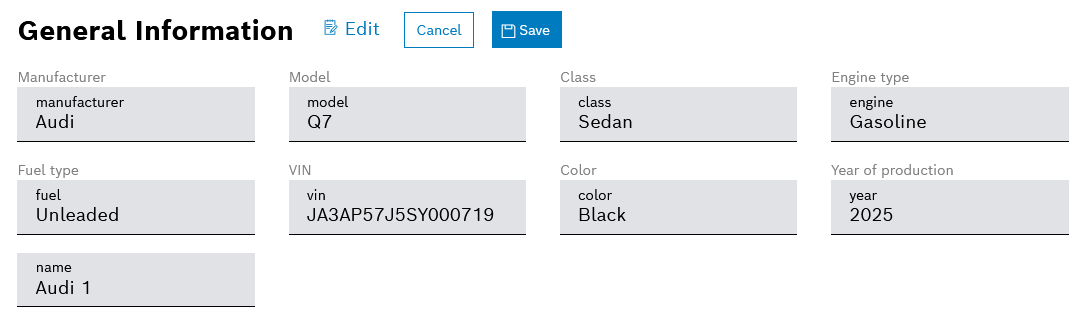 11. In a similar way, add the following properties with a basic description for each: model, class, engine, fuel, vin, color, year.