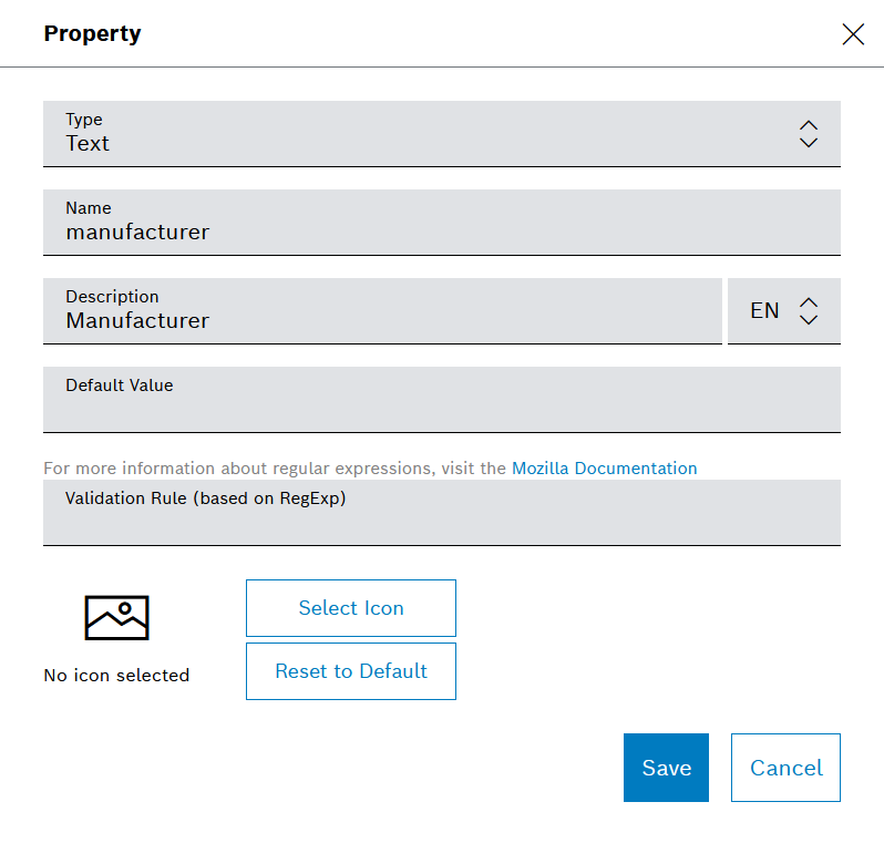 10. On the dialog that opens, fill in the property details as on the screenshot below, which shows how to add for example the manufacturer property with a basic description.