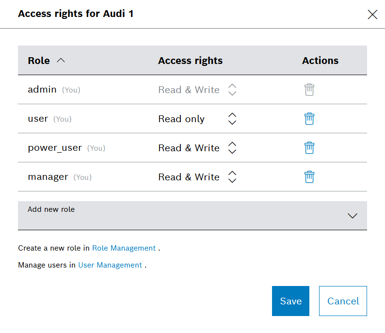 2. On the dialog that opens, you can add and remove roles and set the access rights for each of the added roles.