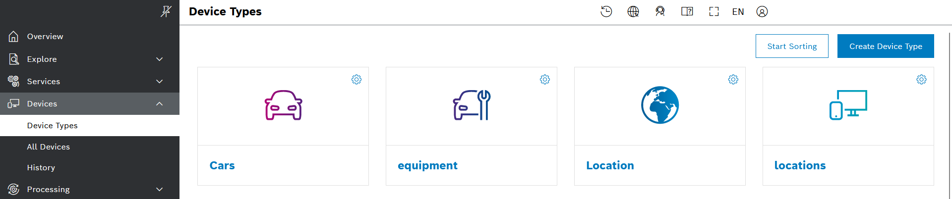 The Devices menu of Bosch IoT Insights incorporates the Device Management. The Device Management offers a visualization of physically existing devices. Devices, their properties, status, components, and relations can be viewed and managed. Devices are clustered by device types. The device types can be enriched with various properties. The device type properties serve as default properties for all affiliated devices.