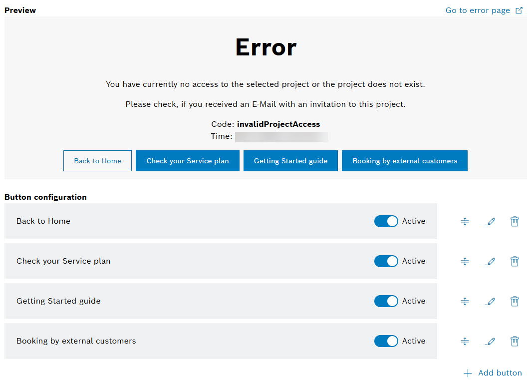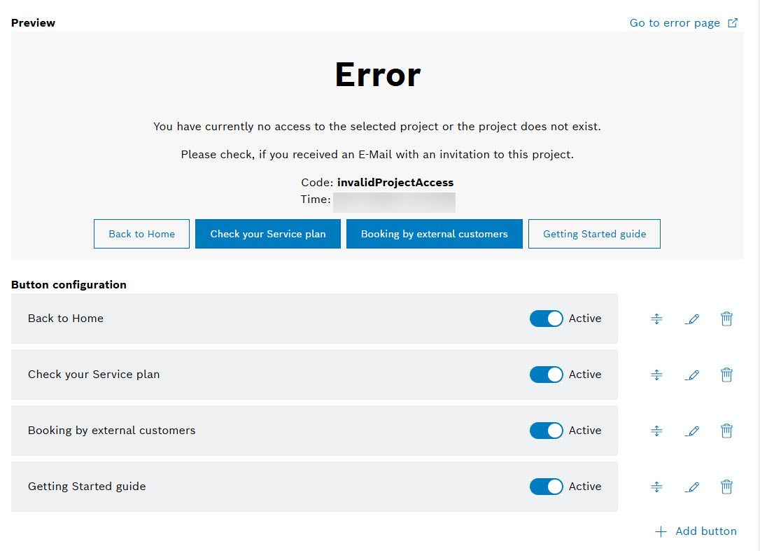From the Button configuration section below the Preview, you can activate each button to make it visible on the Error page of your project using an Active toggle: