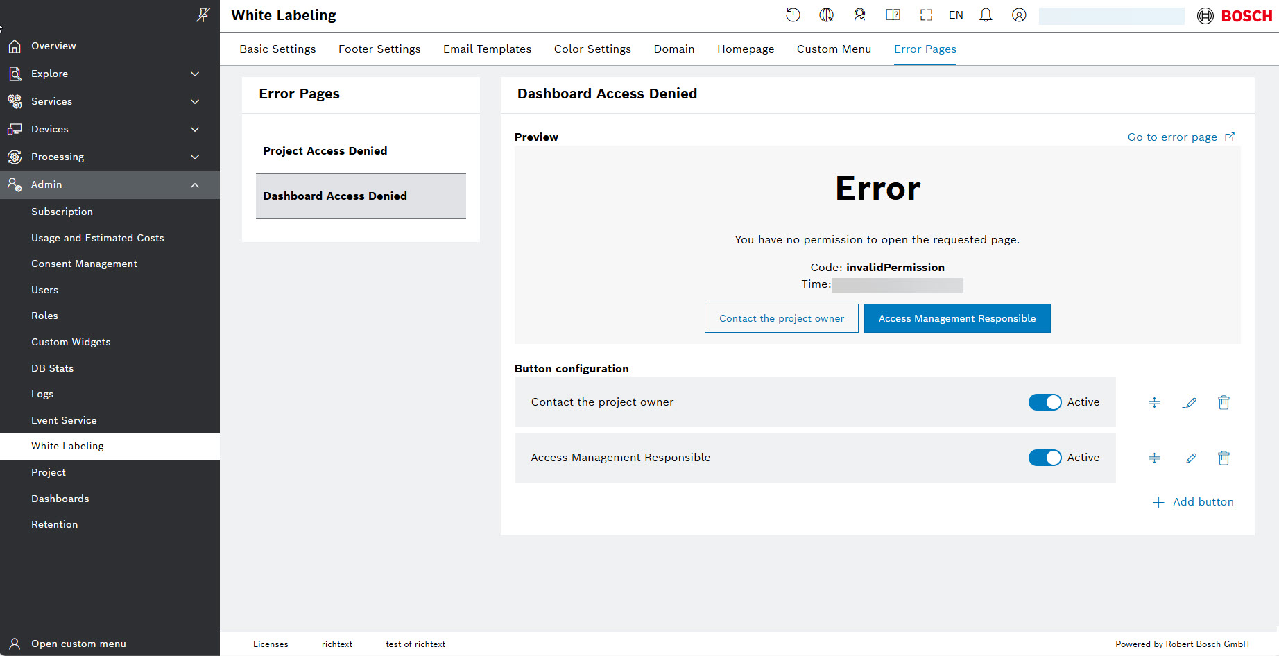 In the Error pages system tab, you can provide a project-specific links on the access denied pages for your users, so that they have the option to notify administrators or be redirected (e.g., via a link) to a relevant page for further assistance. This also helps the users understand the reason for the access restriction they see. In particular, you can create preconfigured link buttons, and mark them as active so that they be shown to the user.