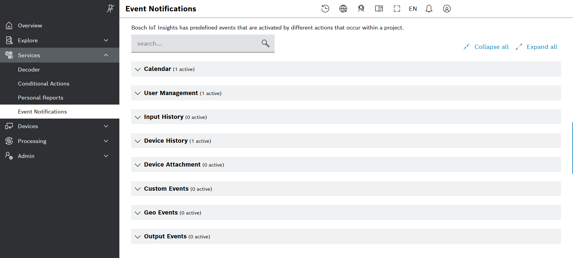 → The list of available events of which you can choose to be notified is displayed by default. - Use the arrows on the left to expand and collapse each event group in order to find the event of interest: