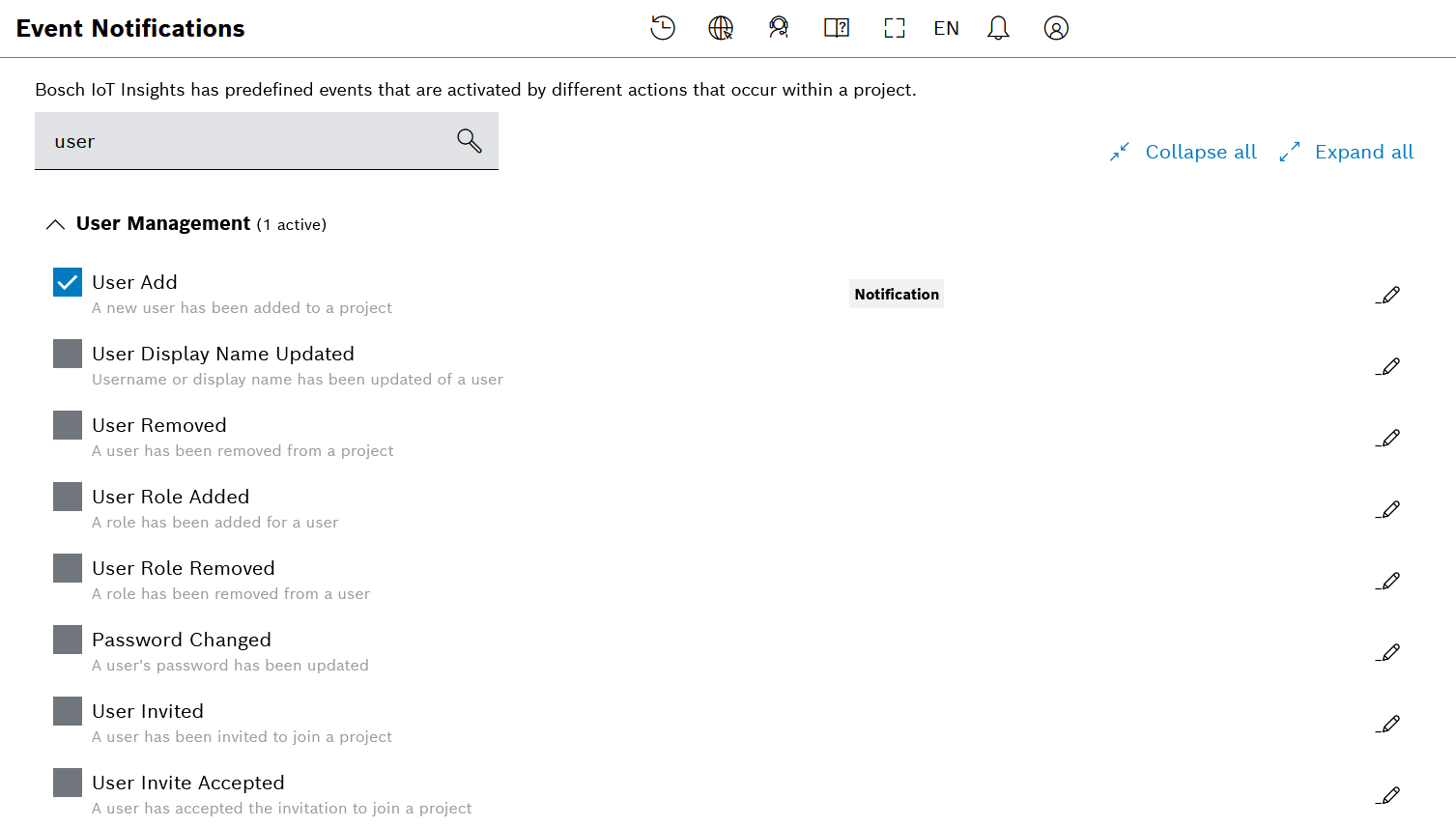 Here you will only learn how to configure notifications for yourself. If you are an Admin and want to configure notifications for multiple users in your project, refer to Event Service.