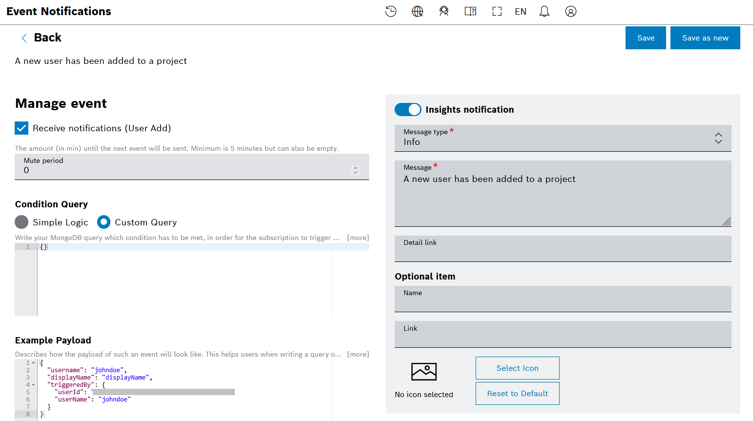 - Finally, in the top right area, click the Save button to save the changes to the current event notification, or click the Save as new button to save the changes in a new notification configuration.
