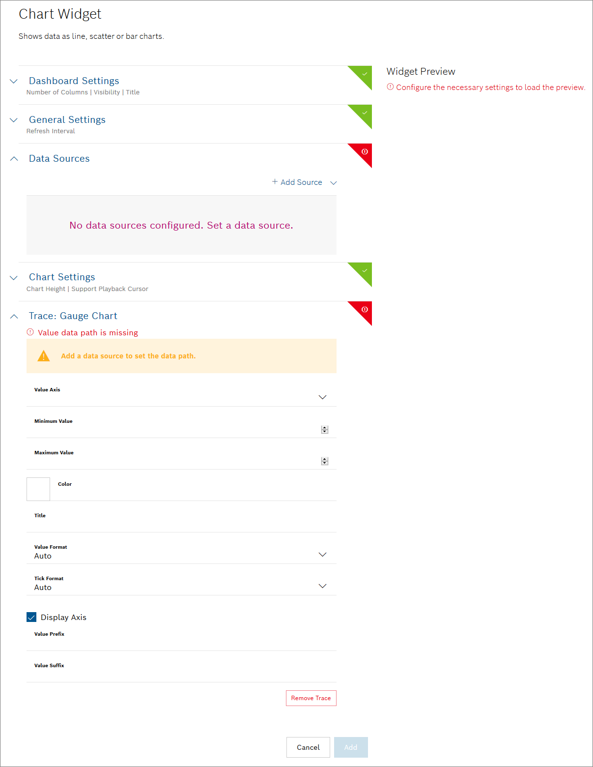 Using the Gauge Chart widget, one value from your data can be displayed, e.g. a signal for pressure, temperature, or speed.