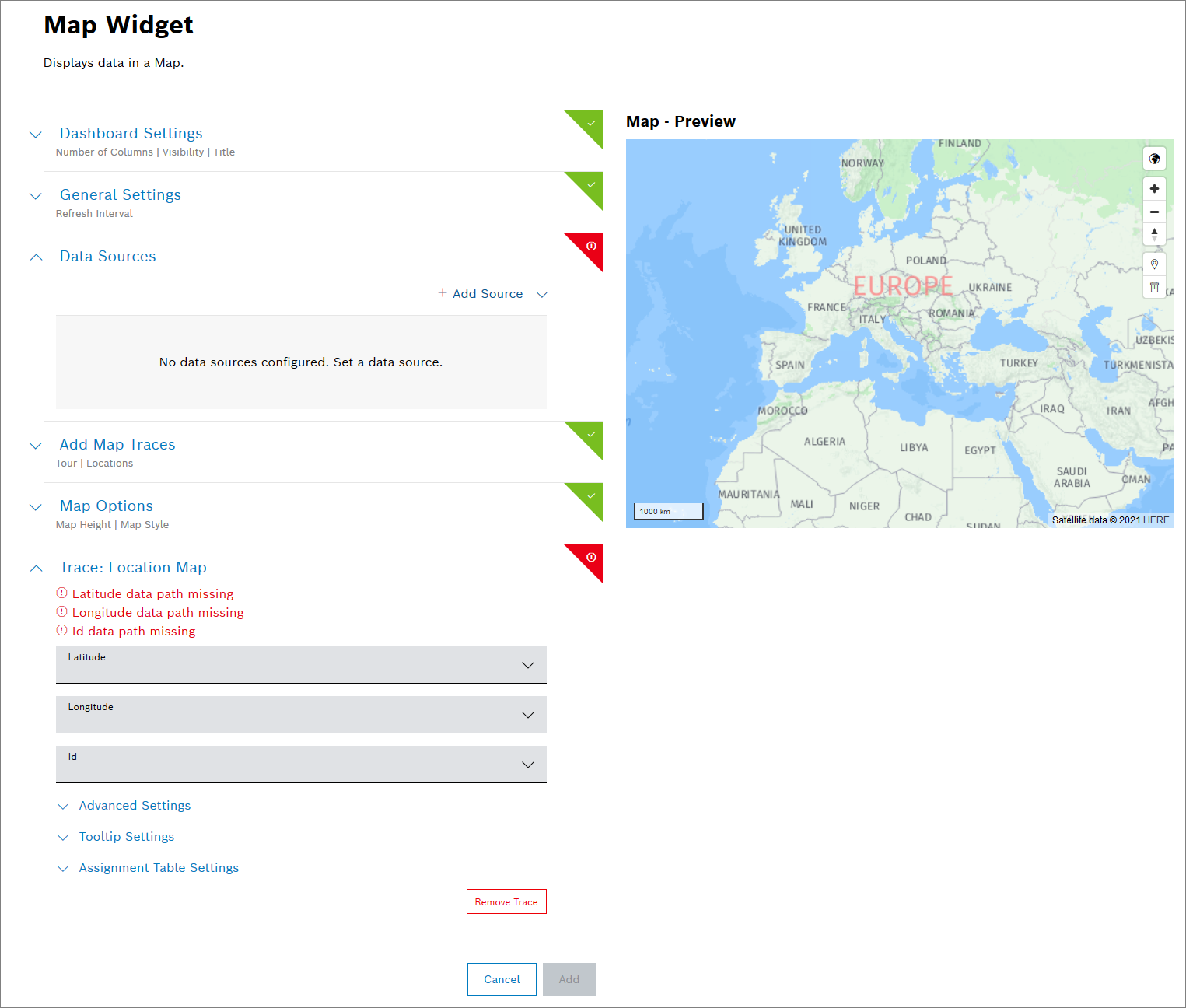 Open the Data Sources pane to configure the data source for the widget.