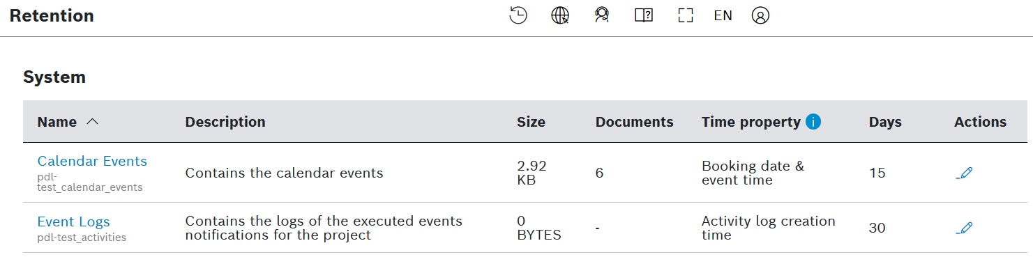 In the Event Logs collection within the System category, you can configure the log retention time which will be applied jointly to all conditional actions executed within the project.