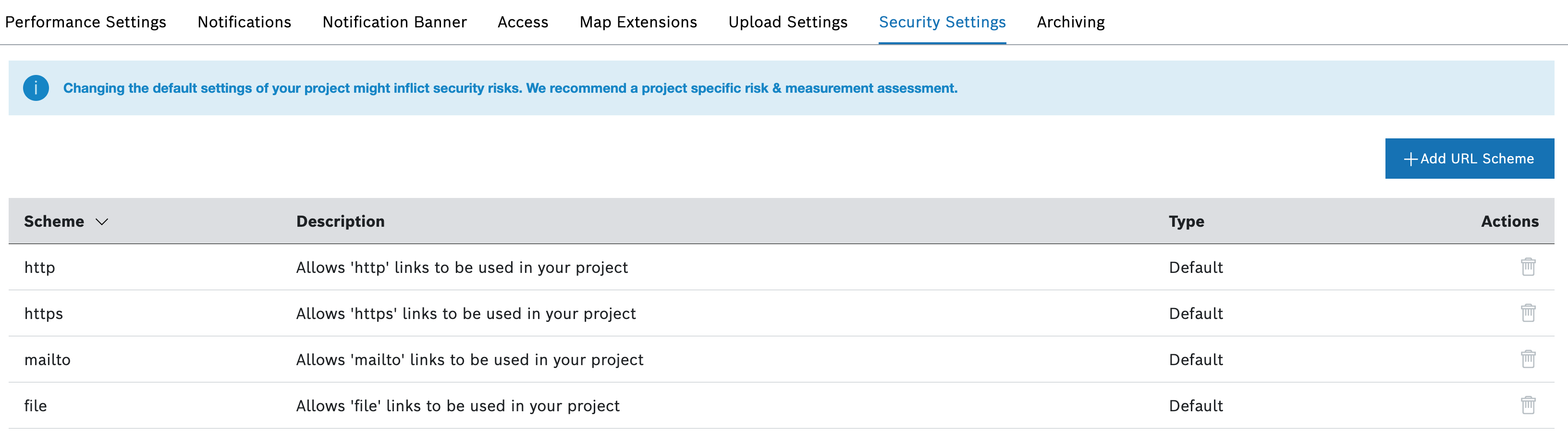 In Security Settings, you can define schemes for URLs that can be opened in your project. The URL schemes for http, https, and mailto are provided by default.