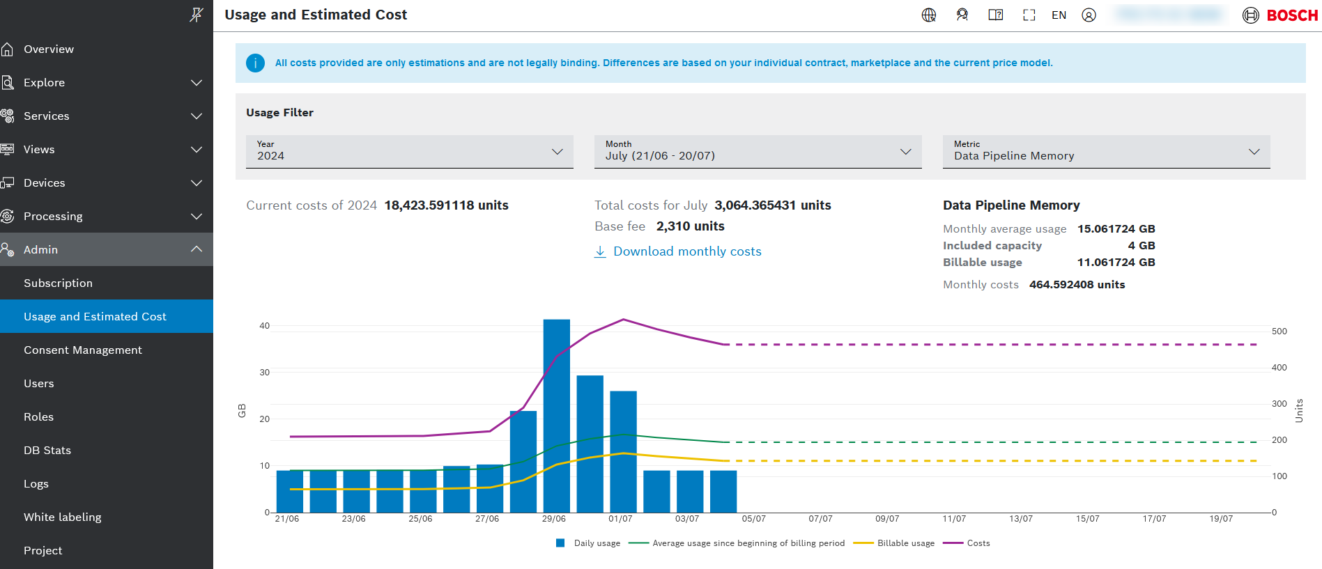 → The view displays the information of your project usage and the estimated costs per selected Year, Month and Metric. - Change the Usage Filter according to your needs.