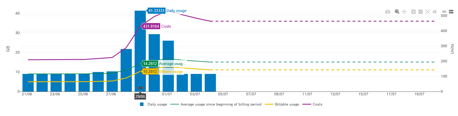 the aggregated usage is calculated as average or as sum from the start of the billing period to each day. - The yellow line shows how much of this usage is not yet included in your plan and thus affects billing.