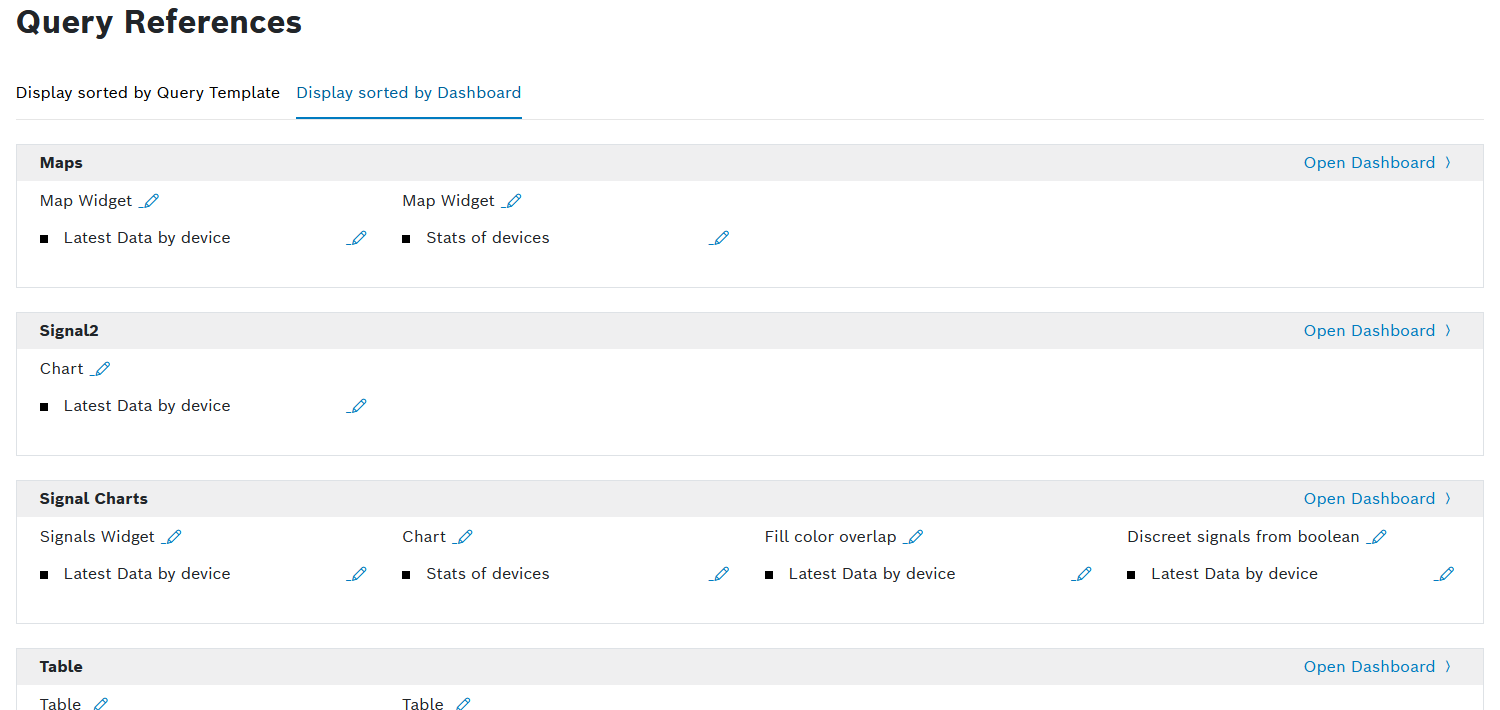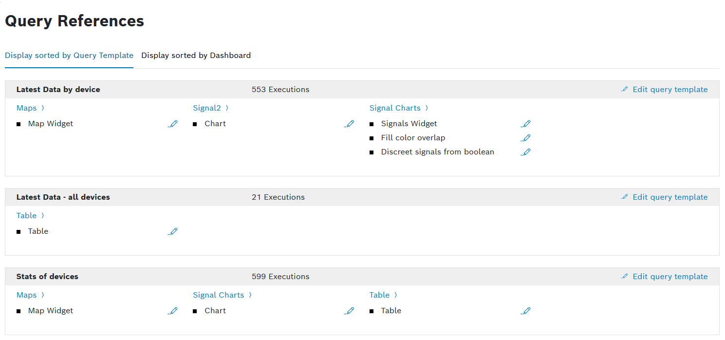 The references are grouped by the query template. All widgets that use a certain query templates are displayed. - Dashboards